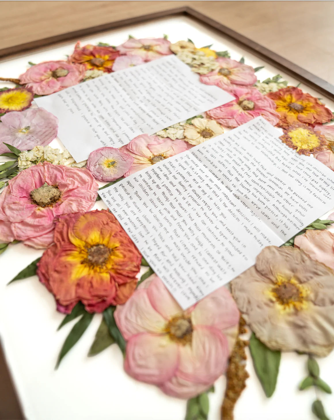 Instead of keeping your vows in the back of a forgotten shoebox, display the words of your loved one in a frame surrounded by the sentimental pressed flowers from your wedding. Looking to create a frame to remember a lost loved one? Handwritten notes included in an array of sentimental memorial flowers is a personal and unique way to keep the memory of your loved one in a bespoke piece of art. A significant momento might look like something that can be pressed in a flush frame such as notes, ribbons, or even butterfly wings!