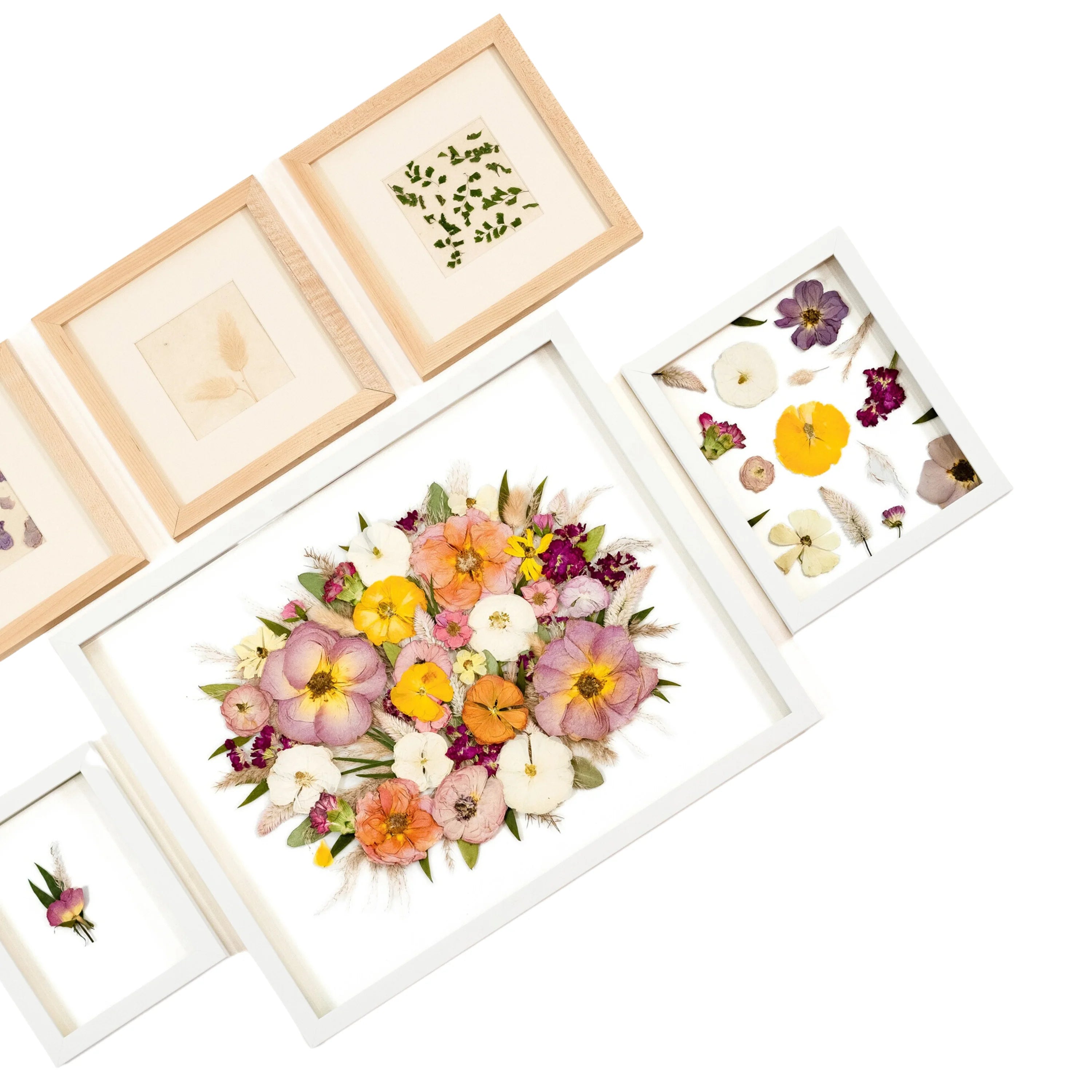 Want a set of frames to display your flowers? Our 8x10 or square single frames are perfect for using smaller pieces of your bouquet to create a cohesive art piece to display.