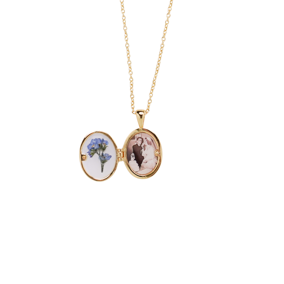 A timeless keepsake designed to hold life’s most cherished moments. This 14k, gold-filled, exclusive design locket is crafted for durability and elegance. Featuring a sealed photo and real preserved Forget-Me-Not bloom, both encased in resin for protection. Waterproof and heirloom-quality, this locket is a beautiful way to keep the memories of your most cherished relationships close to your heart.