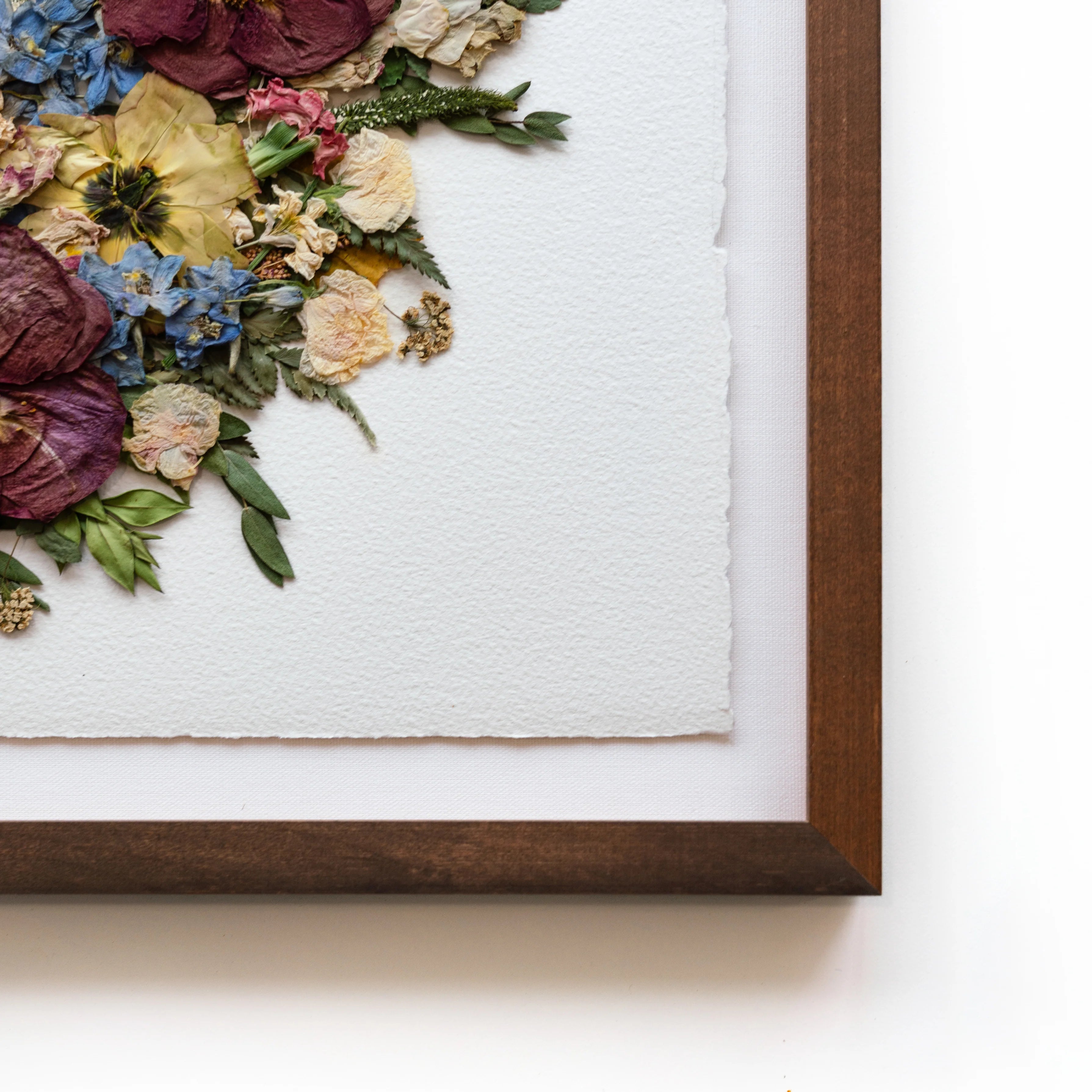 Pressed Floral allows you to choose several backing options to make your piece your own. Our traditional glass on glass look is elegant, unique, and fluid to let your blooms stand alone without being contrasted with any other material. Our linen, paper on linen, and paper on glass options allow your flowers to stand out against a classical solid white background. While Linen covers the entire background, our paper options cover just around your flowers to allow the raw edge of the natural paper to add texture to your piece. .