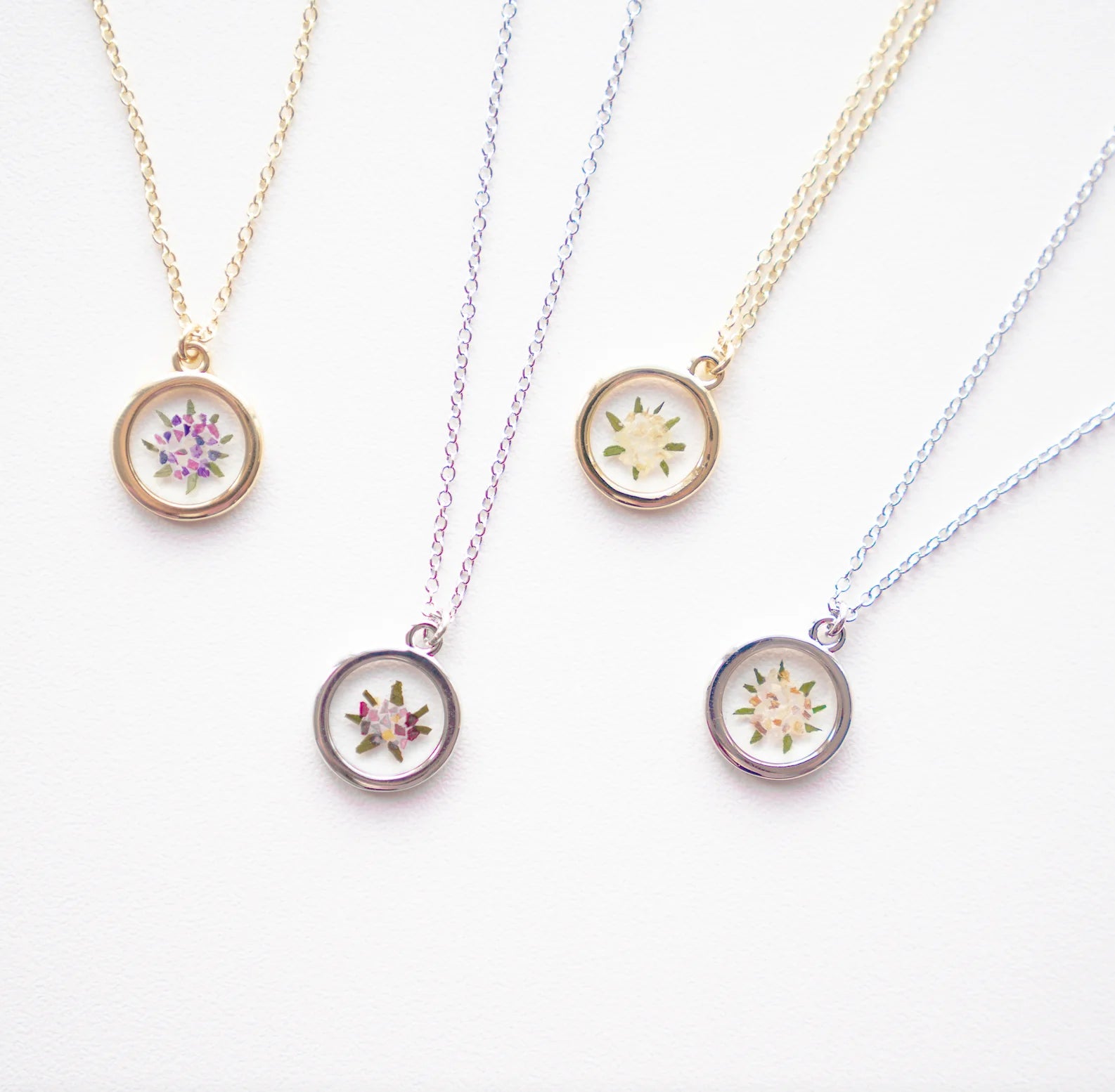 If you want to keep part of your blooms close to your heart, Pressed Floral has the option to design a personalized necklace with the real remnants of your blooms and botanicals pressed within. Add a birth flower charm or ring to symbolize you and your loved ones' birth months.