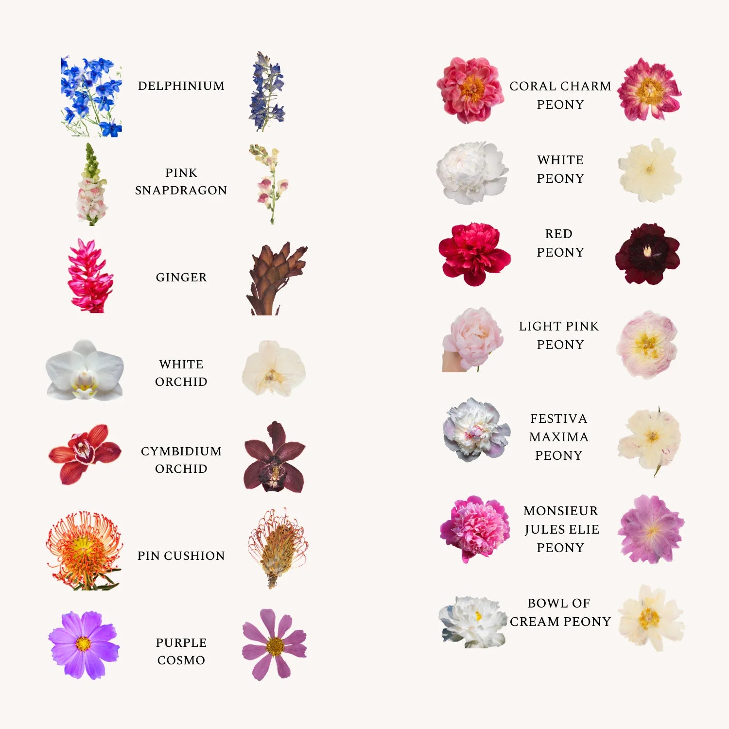Whether you choose your flowers based on personal aesthetics or meaningful stories, we will press any flowers that are in good condition.