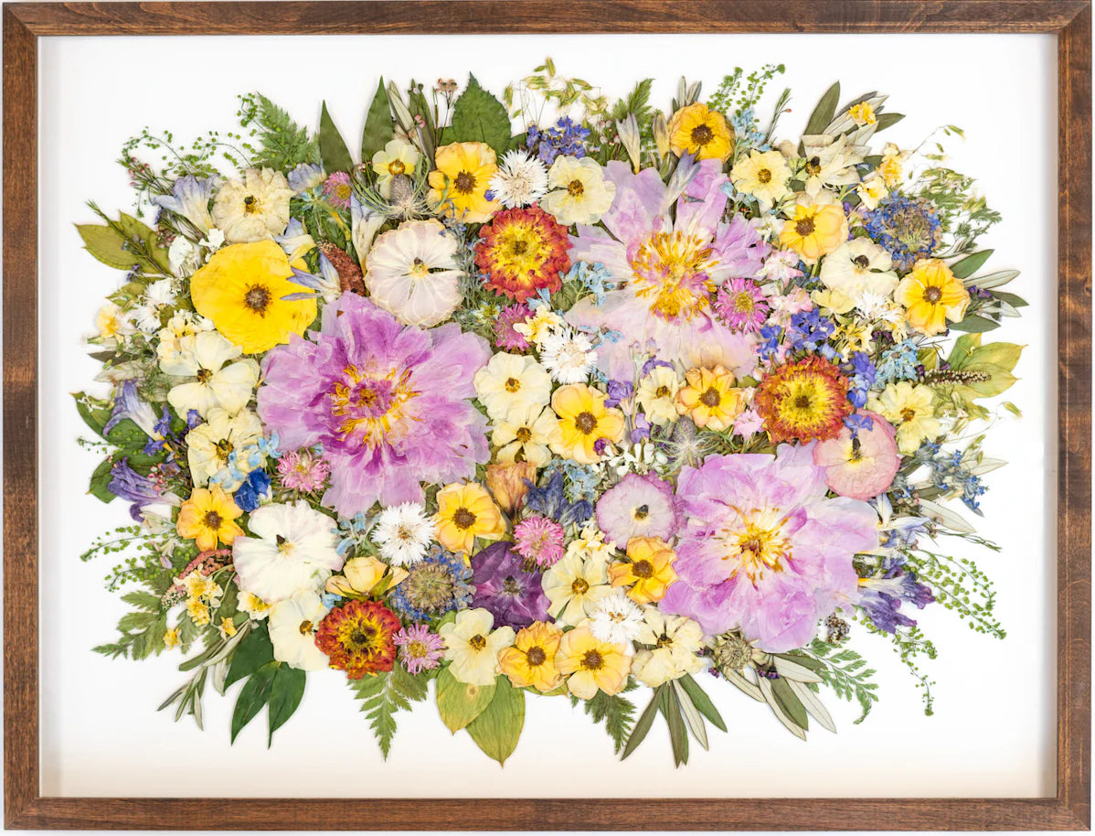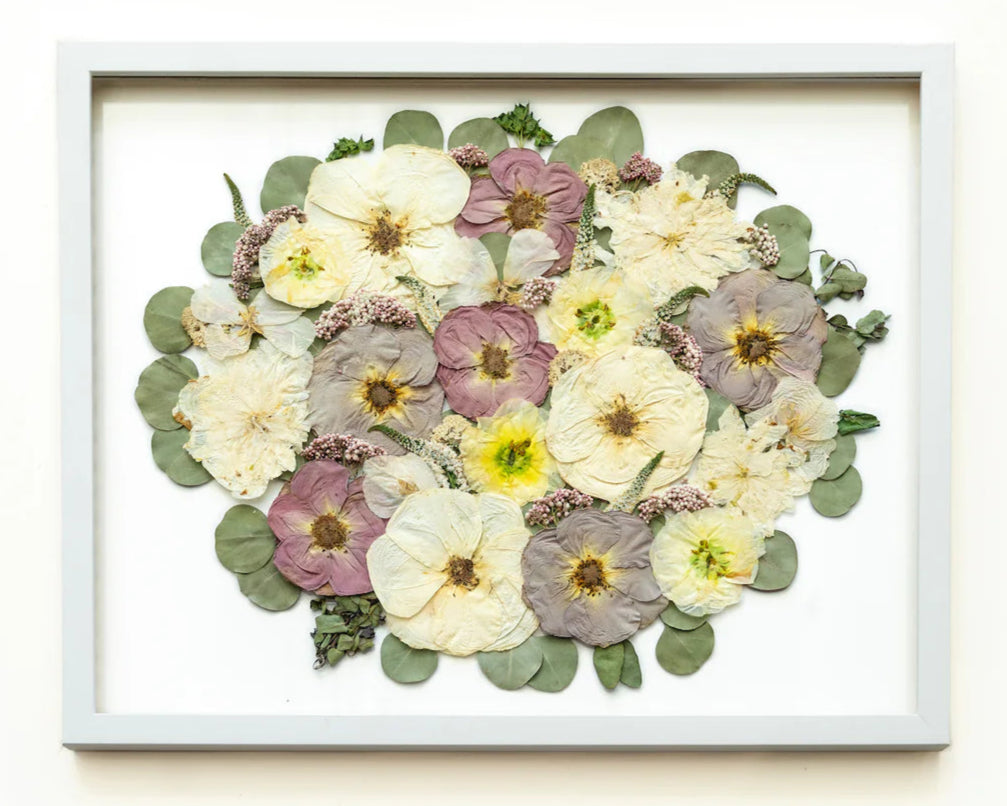Looking for a perfect sentimental gift for your anniversary? With Pressed Floral Recreations, we are able to order flowers from your original wedding bouquet and create a custom framed art-piece! Just send in a picture from your big day and we will figure out the flower ingredient list from the flowers shown.