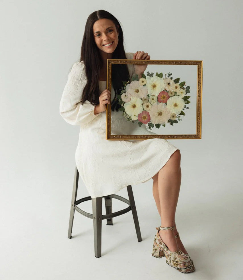 Pressed Floral has come a long way from its beginning! We started out with one designer—CEO, Sarah Ebert—taking local orders and fulfilling them in a lifetime shed to now having over 40 employees working one on one with clients all over the country to design and preserve their sentimental flowers into bespoke pieces of art. The community we have built over a shared love of sentimental moments and beautiful flowers continues to remind us why we do what we do. Your stories, your flowers, and your memories are the heart and soul of Pressed Floral. We are so grateful for the continued support and we are dedicated to creating a service that is always personal, always customized, and always sentimental.